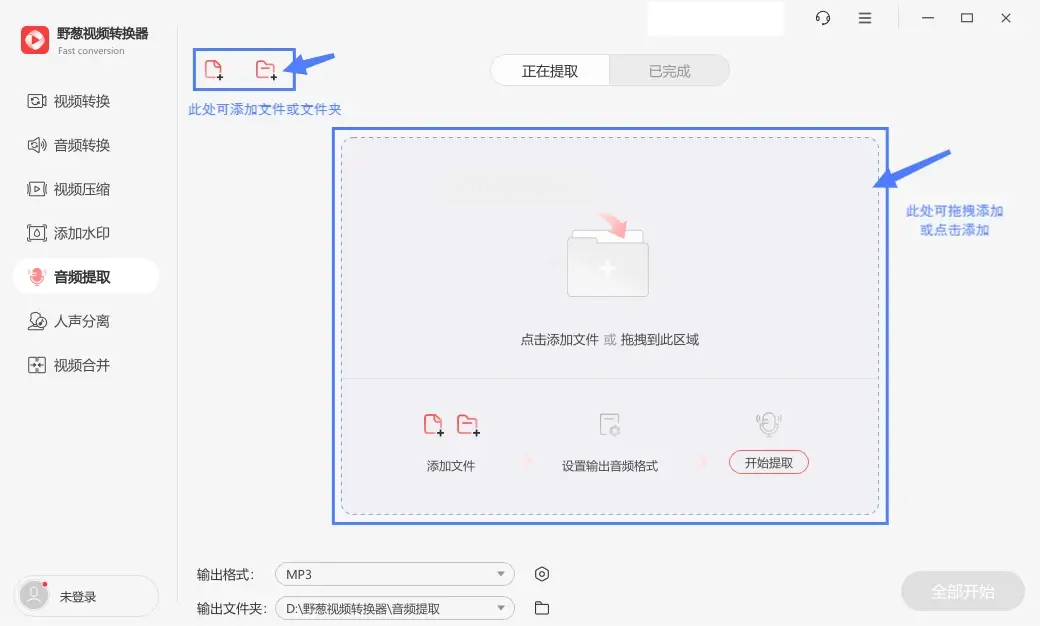 步骤二: 在提取功能的主界面,点击“添加文件”按钮,选择你要转换的B站视频。它同样支持批量添加多个文件。