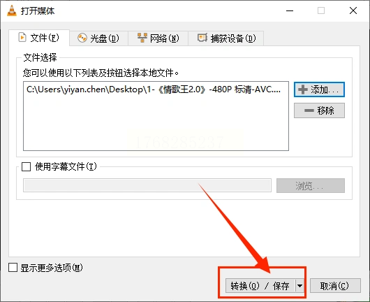 步骤二: 会弹出一个新窗口。点击“添加”按钮,找到并选中你电脑里下载好的B站视频文件,然后点击“转换/保存”按钮(注意,这里可能需要点两次)。