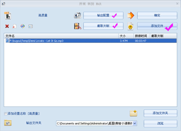 3. 设置参数:选「M4R」格式,比特率建议128-192kbps(平衡大小和音质),点击「确定」。