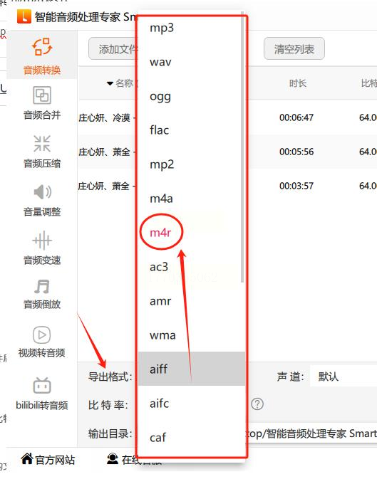 3. 格式设置:在右侧“输出格式”下拉菜单选「M4R」,注意别选错成M4A哦!如果想让铃声更清晰,比特率可以调到320kbps(音质更好但文件稍大),新手直接默认参数也行。