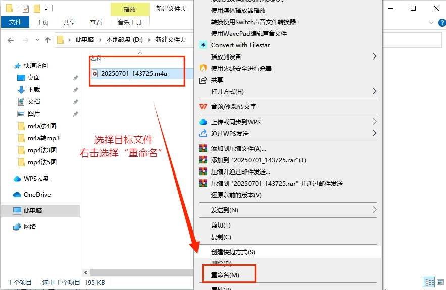 1. 在手机文件管理里找到目标M4A文件,长按选“重命名”