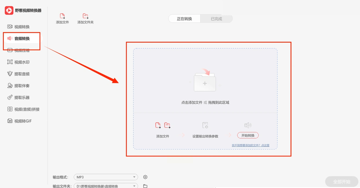 步骤一:打开野葱视频转换器,在首页功能列表中点击“音频转换”模块。