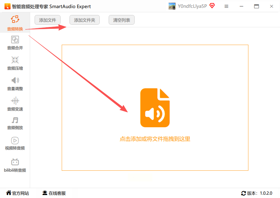 步骤二:在右侧的主操作区域,点击“添加文件”或使用拖拽方式,上传你的M4A音频文件。