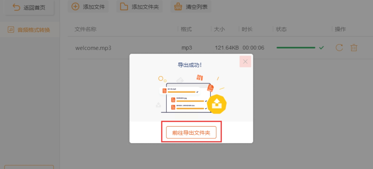 转换完成后,软件通常会弹出一个非常友好的 “导出成功” 或 “转换完成” 的提示框。上面往往还会有一个 “前往导出文件夹” 的按钮,点一下,就能直接打开文件夹,可以看到想要的音频文件了。