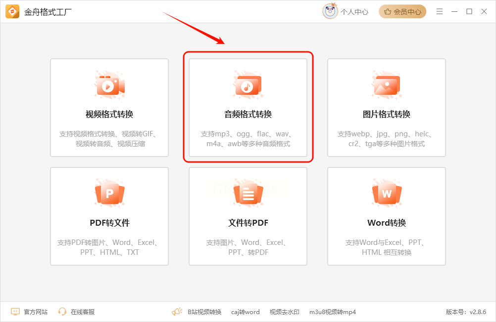 打开金舟格式工厂后,在首页选择“音频格式转换”分类,进入专业音频处理界面。