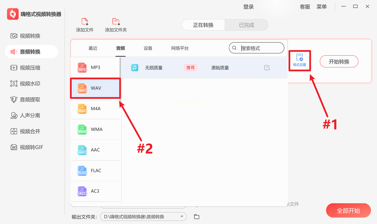 在界面右侧“输出格式”下拉菜单中,先选择“音频”分类,再找到“WAV”格式。若需转换为其他音频格式(如AAC),可直接切换格式类型。
