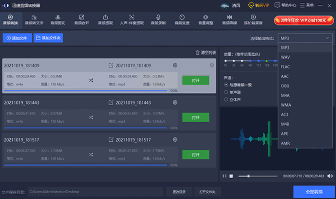 3. 选择输出格式(如MP3)和保存路径,点击「开始转换」,软件会生成新文件(原文件保留)。