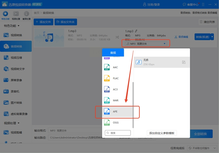 步骤三,文件上传成功后,它们会列表显示在下方。这时,在输出格式的选项里,找到并选择“APE”。软件支持的格式很多,APE是其中之一。旁边通常还有声道、比特率等选项,如果不确定怎么选,保持默认设置通常没问题,软件会自动匹配。