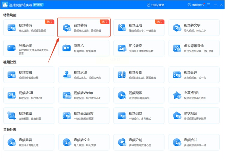 首先,启动软件,在功能菜单里选择“音频转换”。