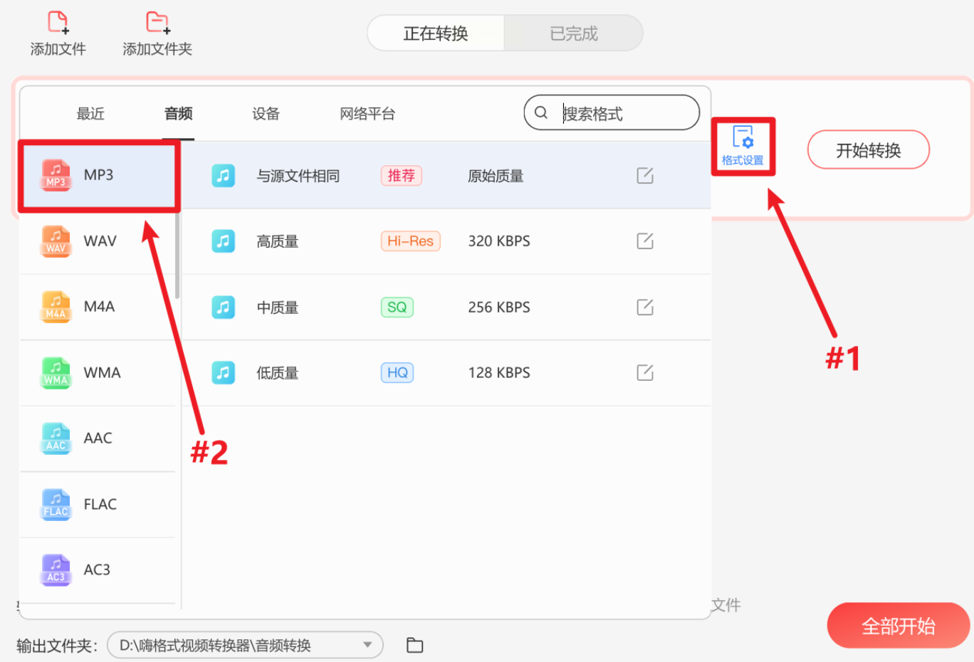 文件添加后,会列在软件中间。接下来,找到 “输出格式” 旁边的设置选项(通常是一个下拉箭头或者“设置”按钮)。点击它,会弹出一个格式选择面板。在“音频”分类下,找到并选中 “MP3”。这个软件支持的格式非常全,你以后如果想进行其他格式互转,也可以在这里操作。