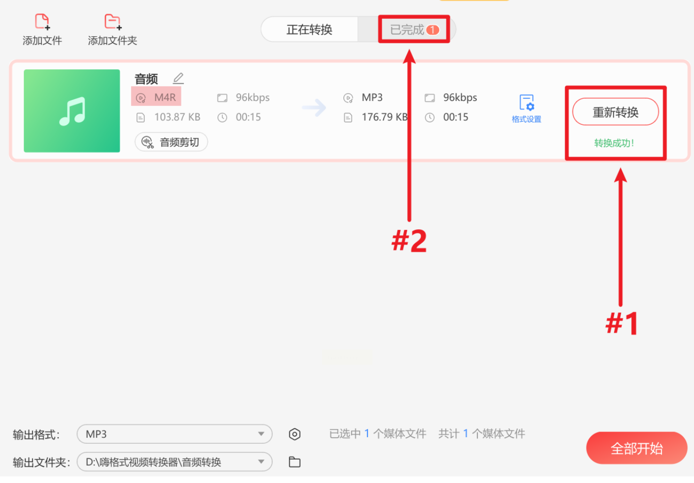 格式选好后,所有的准备工作就完成了。此时,你的目光应该移向软件界面的右下方,那里有一个醒目的大按钮—— “开始转换” 或者 “全部转换”。放心地点击它吧。软件会批量处理你添加的所有文件,因为都是音频小文件,转换过程会非常迅速。转换结束后,你可以直接点击文件后面的 “打开” 链接,快速定位到生成MP3文件的位置。