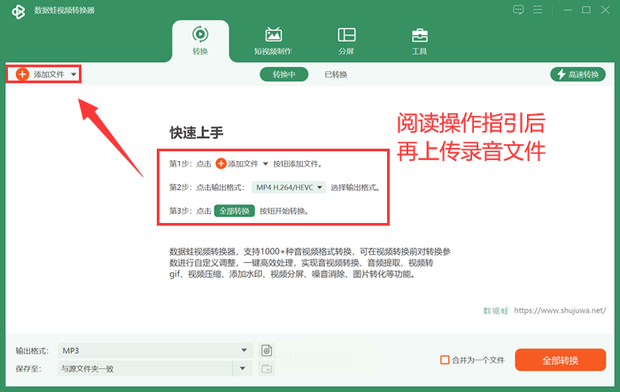 若只有几个文件,点击"添加文件"按钮逐个导入;若有大量录音(比如10个以上),直接用"添加文件夹"更高效——软件会自动扫描文件夹内所有音频文件。也可直接将录音文件拖拽到操作区,支持拖放批量导入。
