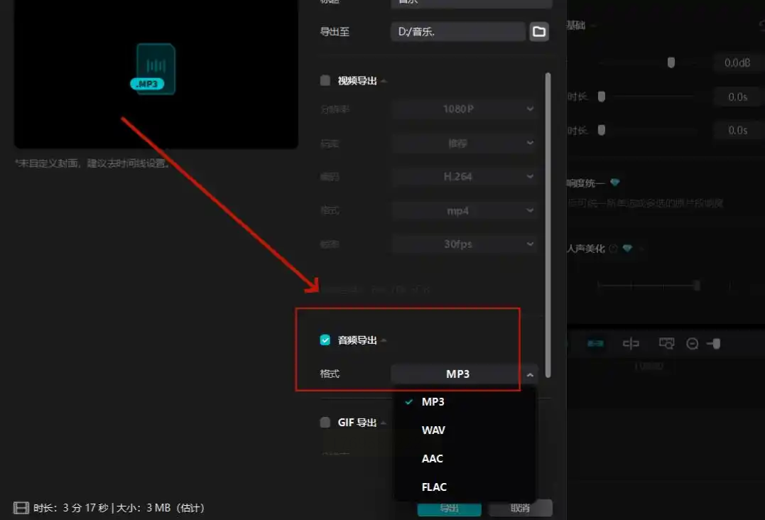 在"导出格式"下拉菜单中选择"MP3"