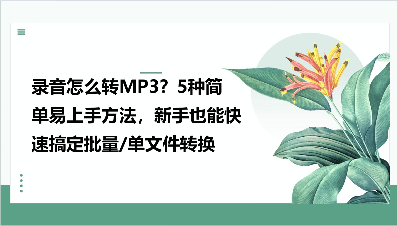 在现代办公和生活中,录音文件无处不在——会议纪要、采访记录、课堂笔记甚至语音备忘录,都可能以不同格式存在。但不同设备生成的音频格式(如WAV、AAC、M4A)往往兼容性差,传输或分享时容易出问题。这时,把录音转为大众通用的MP3格式就成了刚需。本文将从用户实际需求出发,拆解5种简单易上手的转换方法,帮你高效解决格式转换难题。
