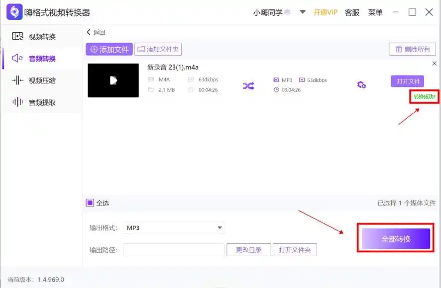 点击右下角"全部转换",软件会自动处理所有导入文件,转换完成后在指定路径找到新生成的MP3文件。