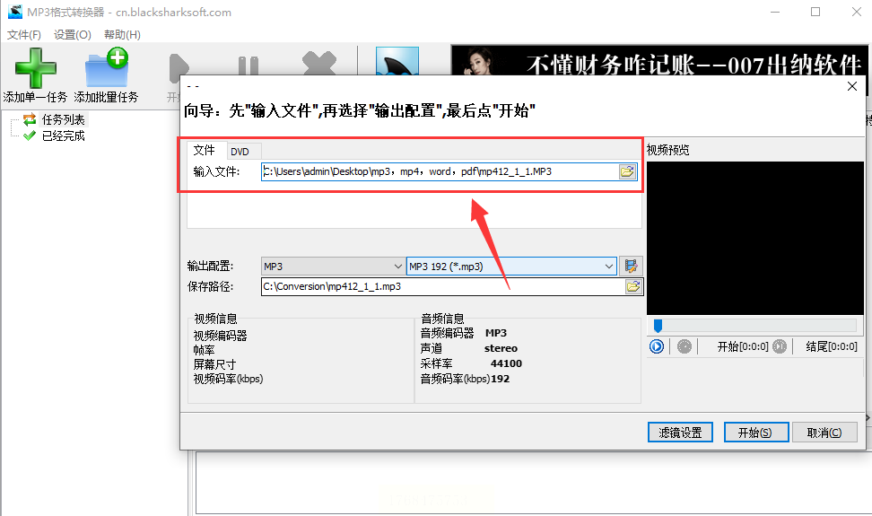 这是一款轻量级的工具。在软件界面中找到“输入文件”区域,导入你的MP3音频。然后在“输出配置”中,将格式设置为“FLAC”,最后点击“开始”按钮运行转换程序。