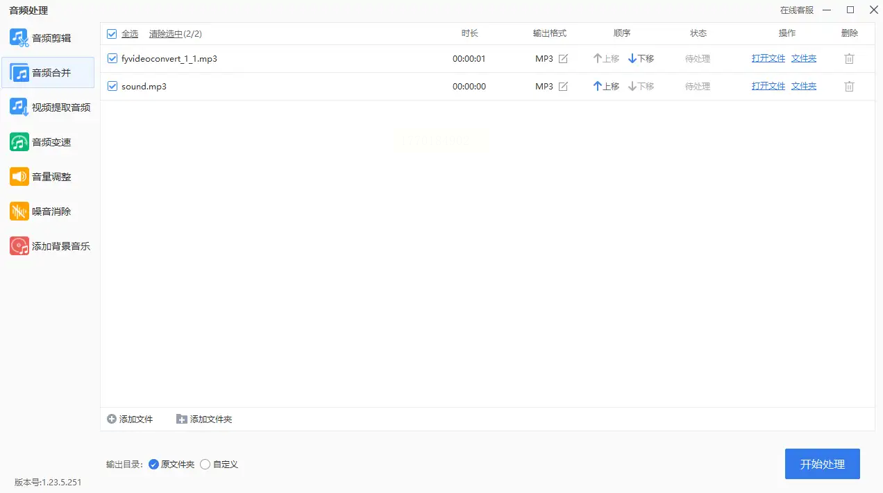 5. 点击「开始处理」,处理过程中软件会显示实时进度,处理完成后用手机或电脑播放器试听,检查是否有杂音