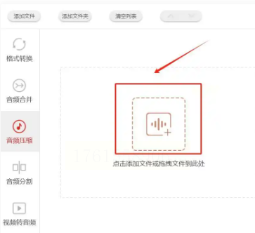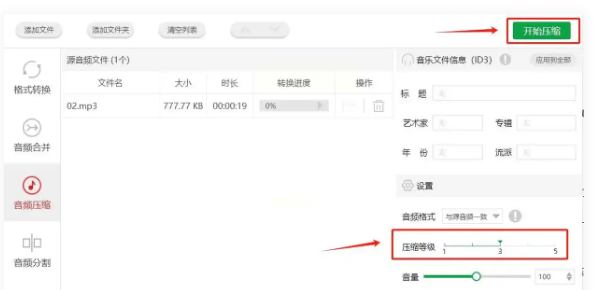 启动软件后,在左侧功能栏选择“音频压缩”。界面分为三个区域,左侧导航、中间文件列表、右侧参数设置。