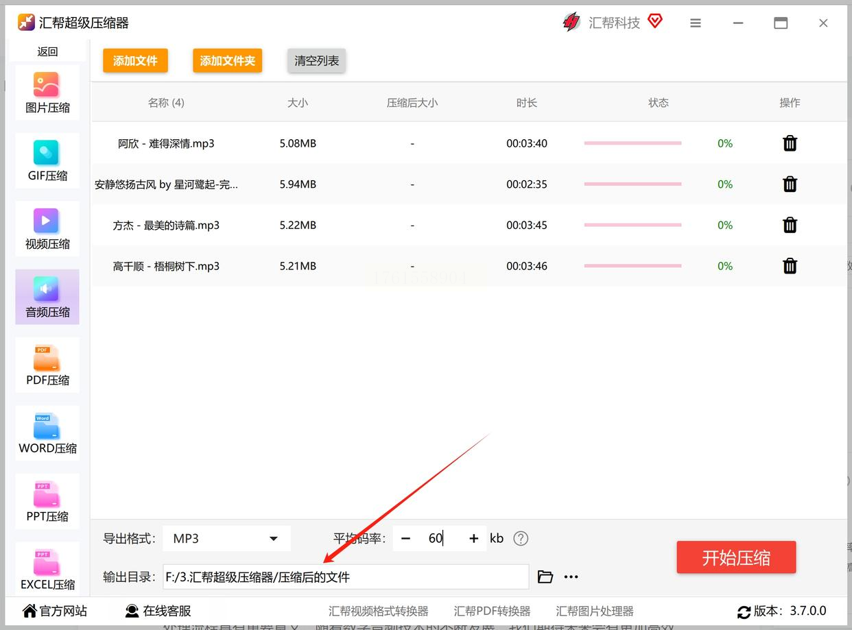 指定输出路径,建议新建一个“已压缩音频”文件夹,避免和原文件混淆。