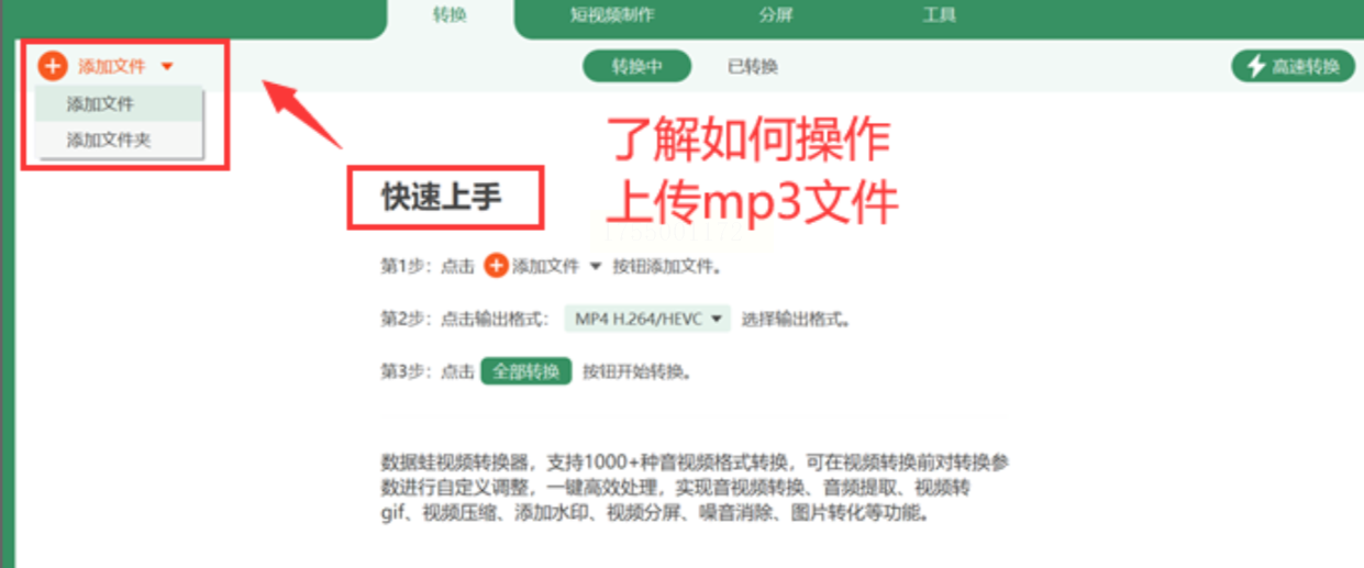 2. 添加文件: 点击“添加文件”按钮,将需要转换的MP3文件批量添加到软件中。