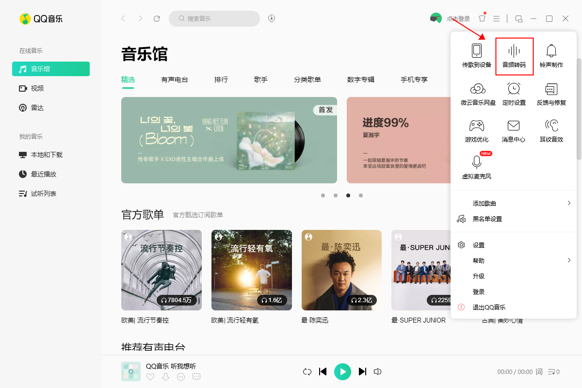 1. 打开QQ音乐客户端,在右上角菜单中找到“音频转码”入口。