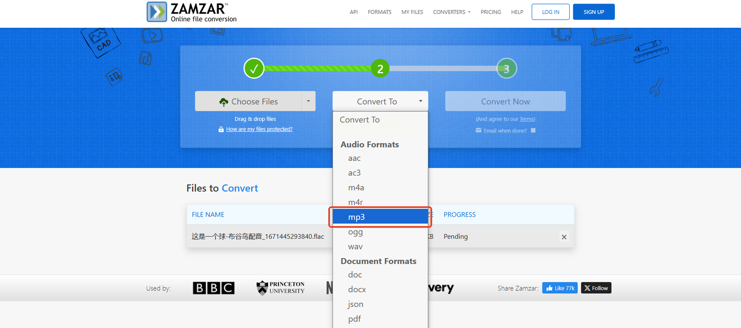 首先,在浏览器中打开Zamzar的官方网站。在它的主页上,你会看到明显的“选择文件”选项,点击它来上传你的FLAC音频。
