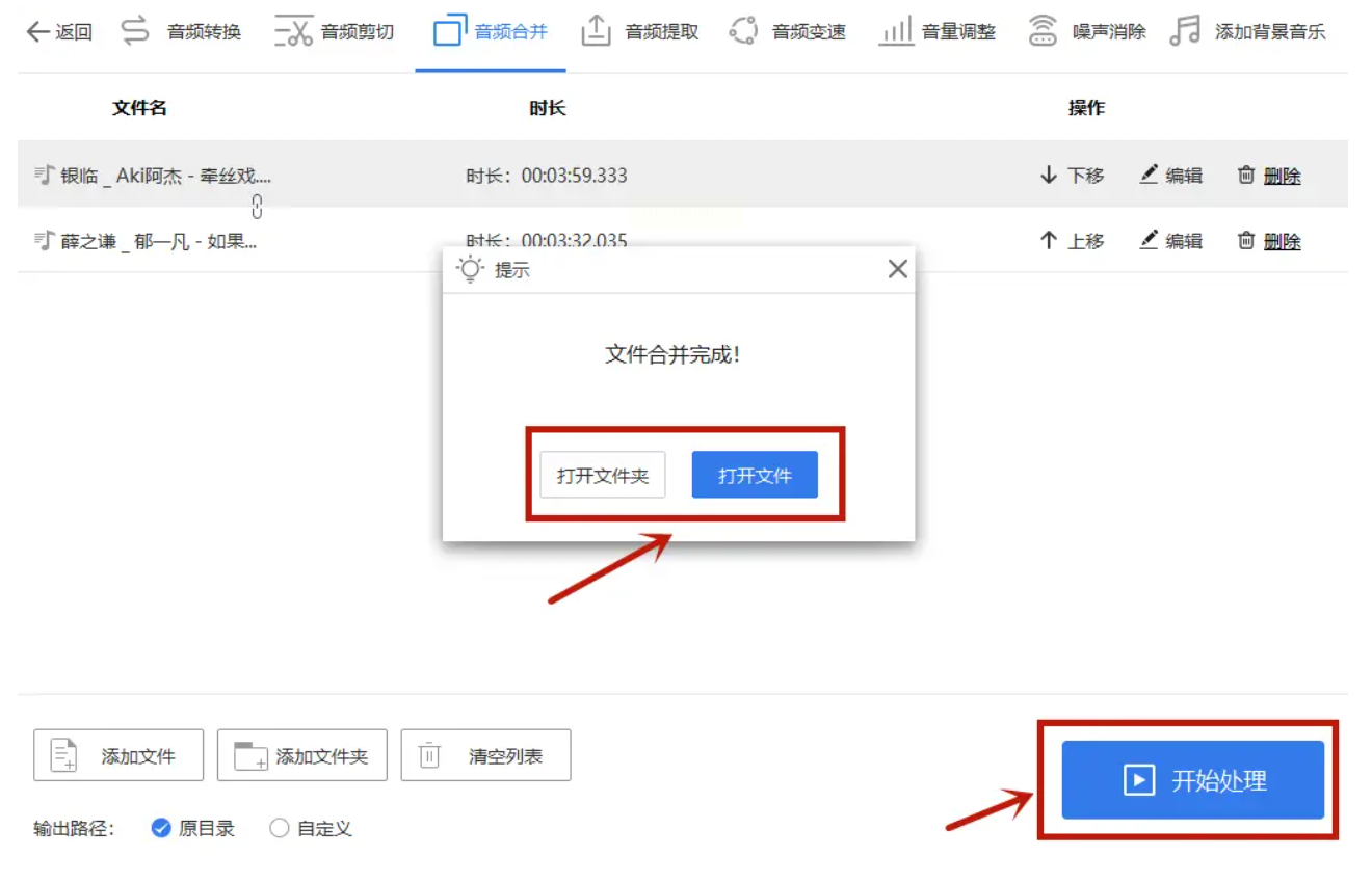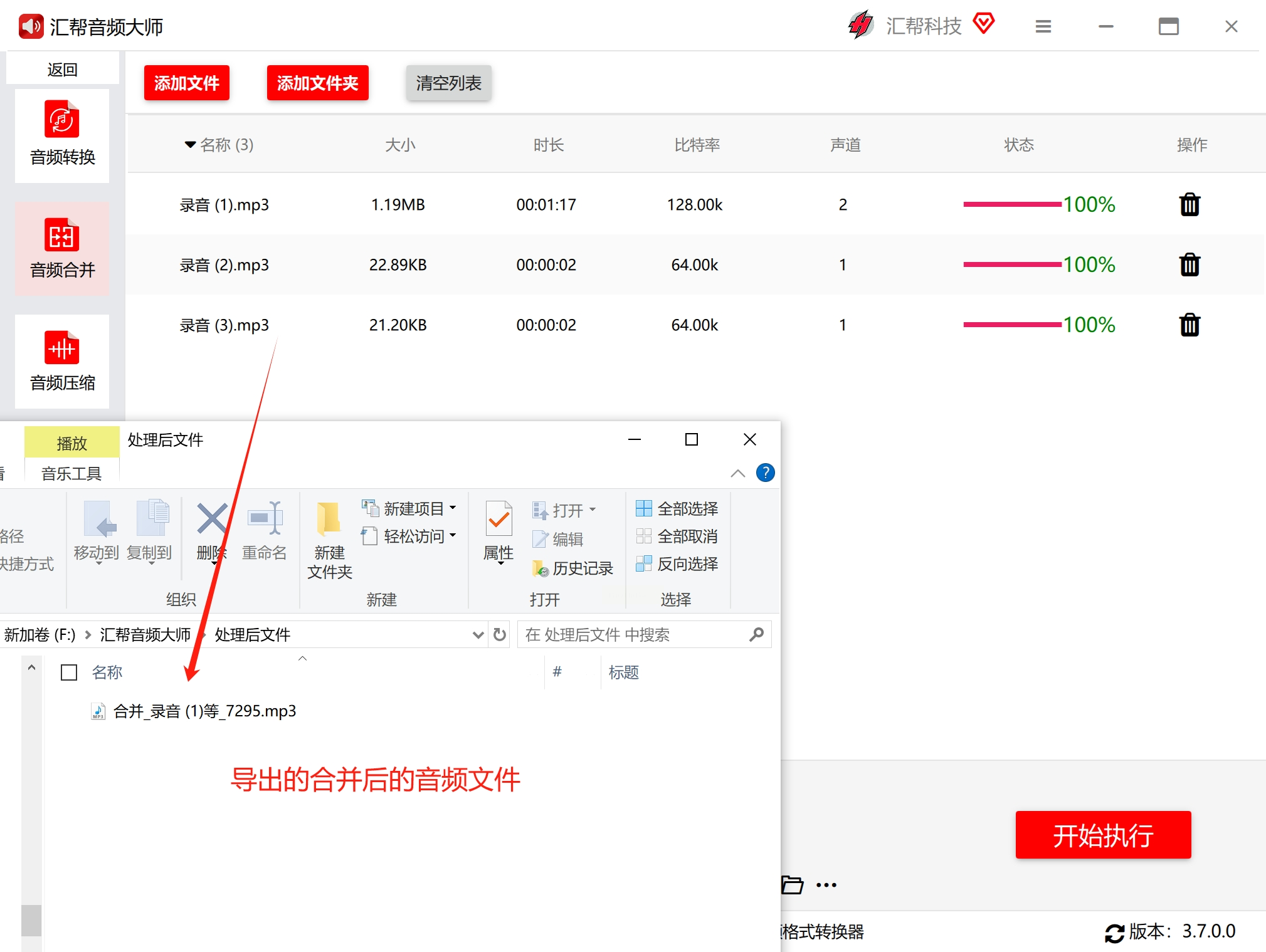 5. 执行合并操作:所有设置检查无误后,点击那个大大的【开始执行】按钮。软件就开始工作了,稍等片刻,处理完成会有提示。这时,去你刚才设置的输出文件夹里,就能找到合并好的完整音频文件了。
