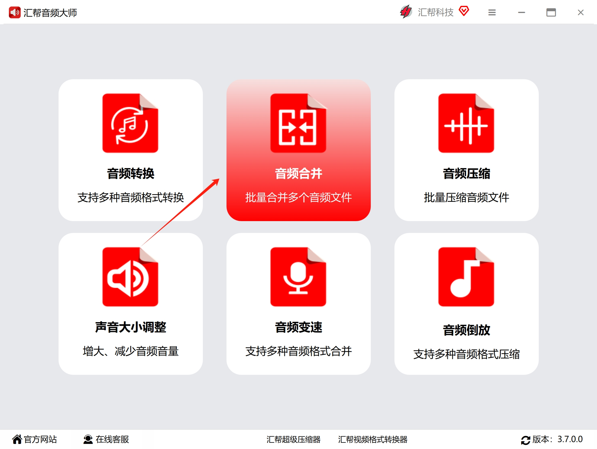 1. 启动软件,选择核心功能:打开“汇帮音频大师”软件,它的主界面通常会清晰展示各种功能图标。我们直接找到并点击【音频合并】这个功能模块,进入专门的操作页面。