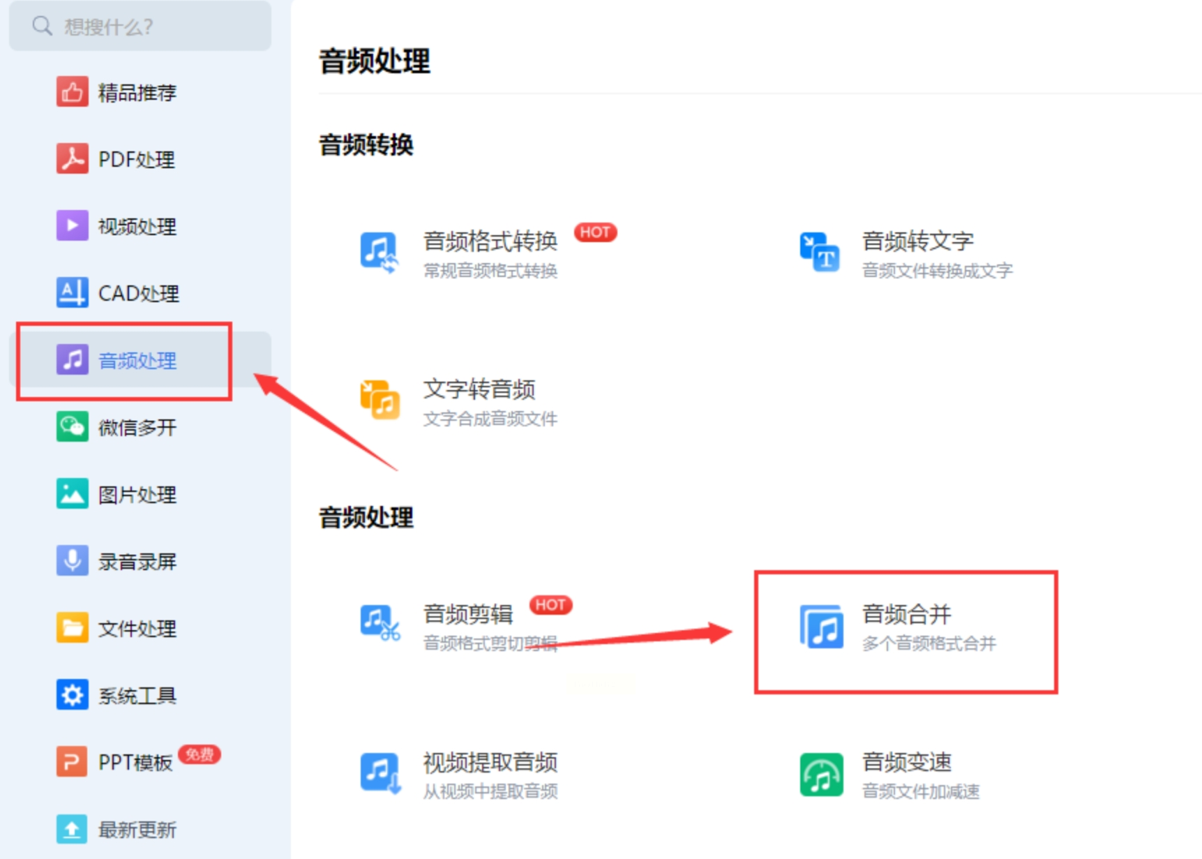 1. 打开软件,找到功能入口:首先,在电脑上打开“办公中心”软件。在主界面或左侧功能列表中,找到并点击【音频处理】这个大类别。进去之后,你会看到一堆音频相关的功能,直接找到那个叫【音频合并】的选项,点它,就正式进入合并流程了。