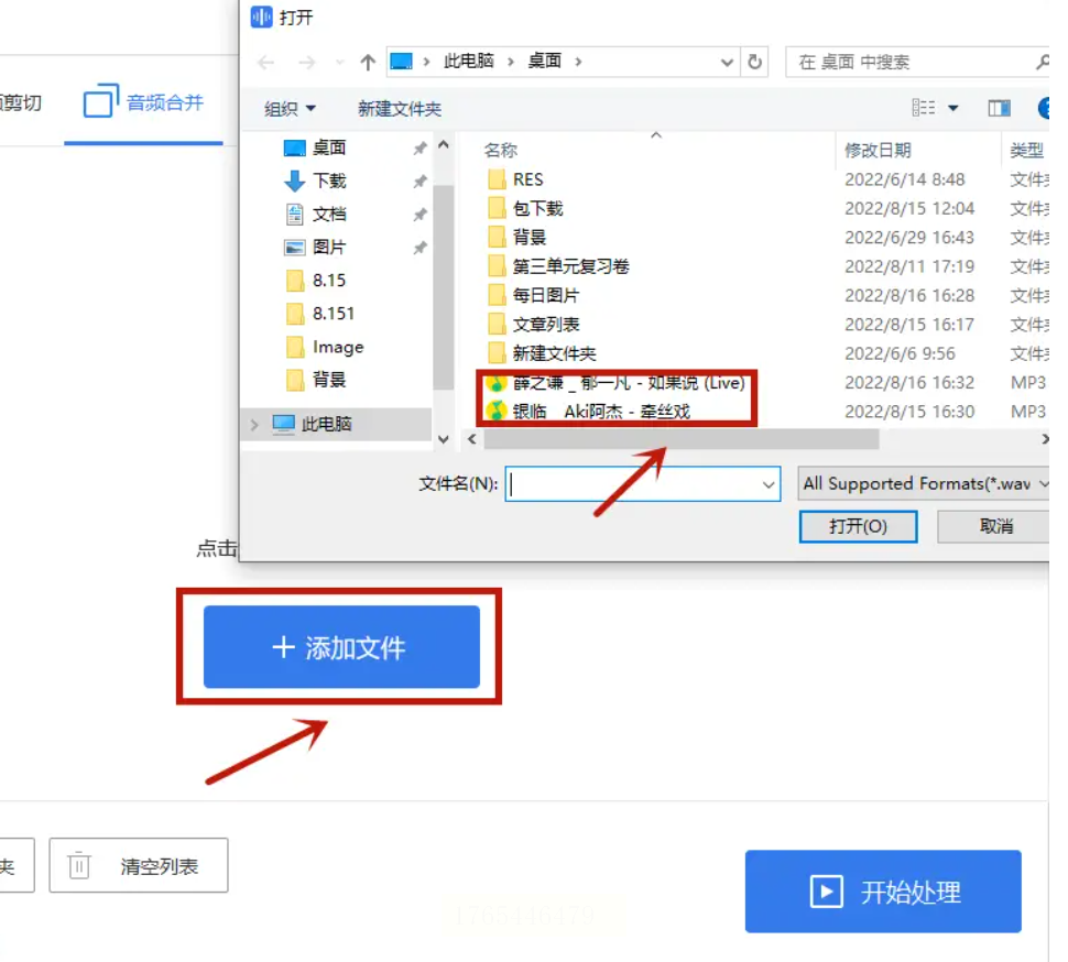2. 上传你的音乐文件:点击【音频合并】后,软件会弹出一个文件选择窗口。这时,把你想要合并的几首歌(或音频文件)统统选中,一次性拖进去或者点击“添加文件”按钮上传。支持批量添加,不用担心文件多。