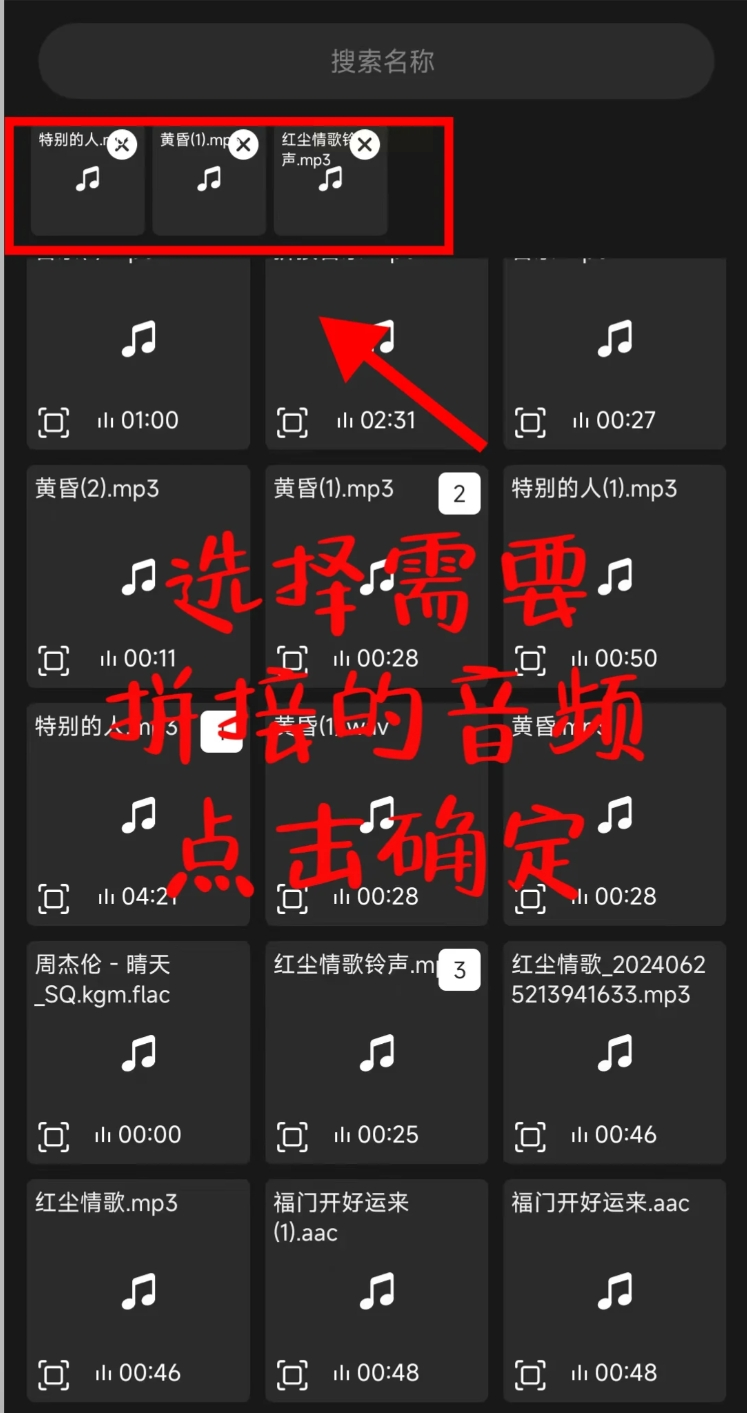 2. 从手机曲库选择音乐:进入拼接界面后,APP会提示你选择音乐。点击【选择音乐】或“+”号,通常会跳转到你的手机本地音乐库或文件管理器。在这里,勾选所有你想合并的歌曲。