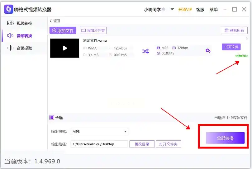 步骤三:设置输出格式为MP3,同时可以自定义输出路径。软件会在转换完成后自动提示,并且可以直接点击“打开文件”预览转换后的音频,检查音质是否符合预期。