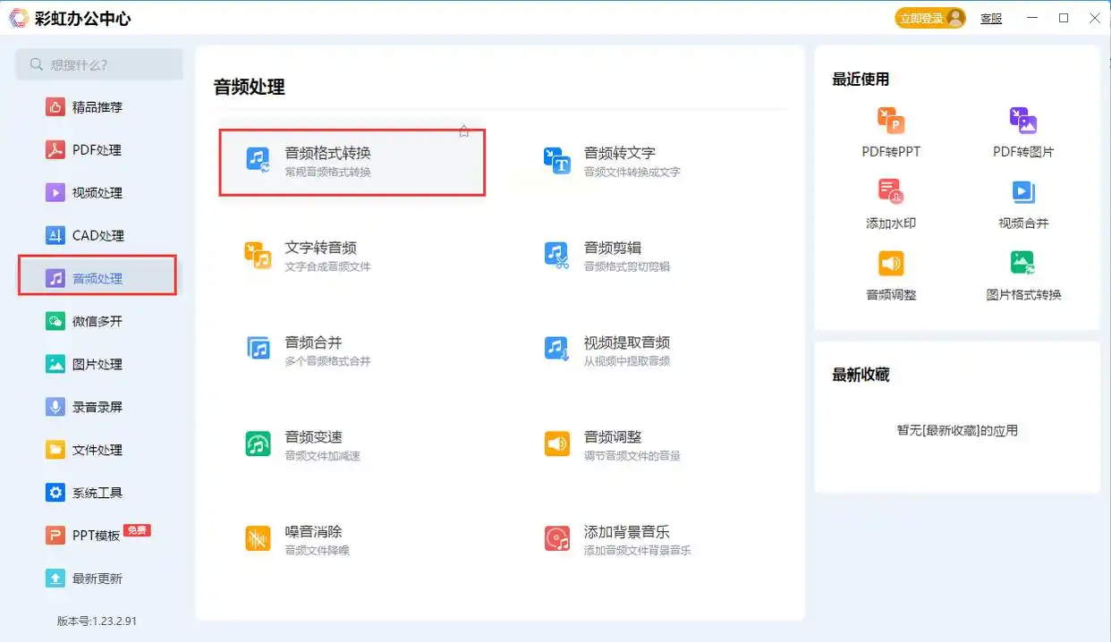 步骤一:首先需要在电脑上安装彩虹办公中心,安装过程很简单,按照提示一步步操作就好。安装完成后打开软件,在主界面找到“音频处理”模块,点击“音频格式转换”进入专门的转换界面。