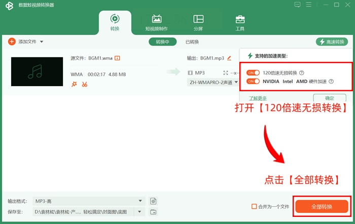 步骤四:点击“全部转换”后,软件会开始处理。这里有个120倍速转换的功能,适合文件比较多的情况,转换速度会比普通软件快很多,处理大量音频时很实用。
