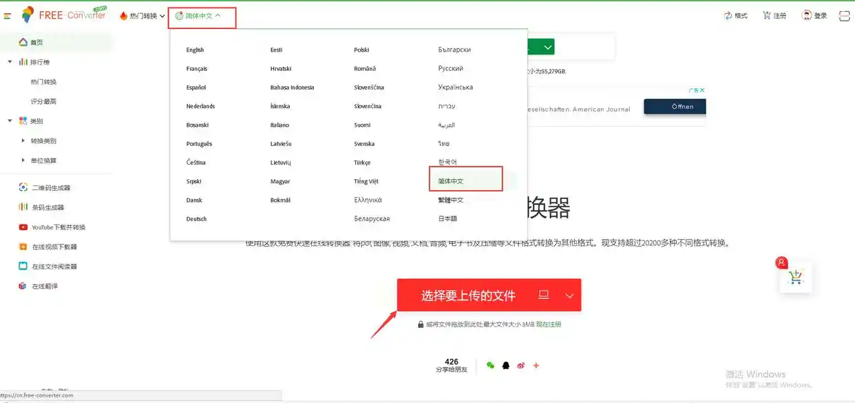 1. 打开平台后,先把语言设置成中文,这样操作更方便。然后点击“上传文件”,选择WMA文件。