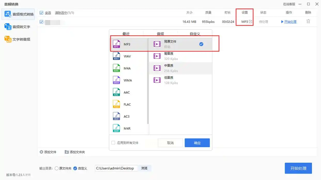 步骤二:添加文件后,软件会自动识别音频格式,在界面右侧有个“输出格式”的下拉菜单,这里可以选择MP3格式。除了MP3,还能转换成WAV、FLAC等其他常用格式,如果你有多种格式需求,这个功能就很实用。