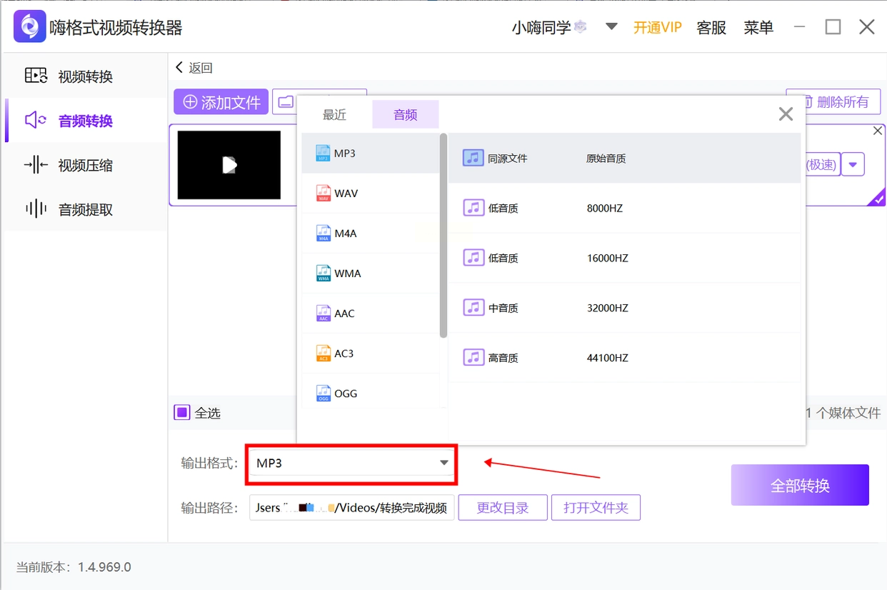 步骤三:在输出格式设置里,选择“音频”分类下的MP3格式,软件提供了多种预设音质,比如“无损转换”“高音质”等,直接选择对应的选项就好,不用自己调整复杂参数。
