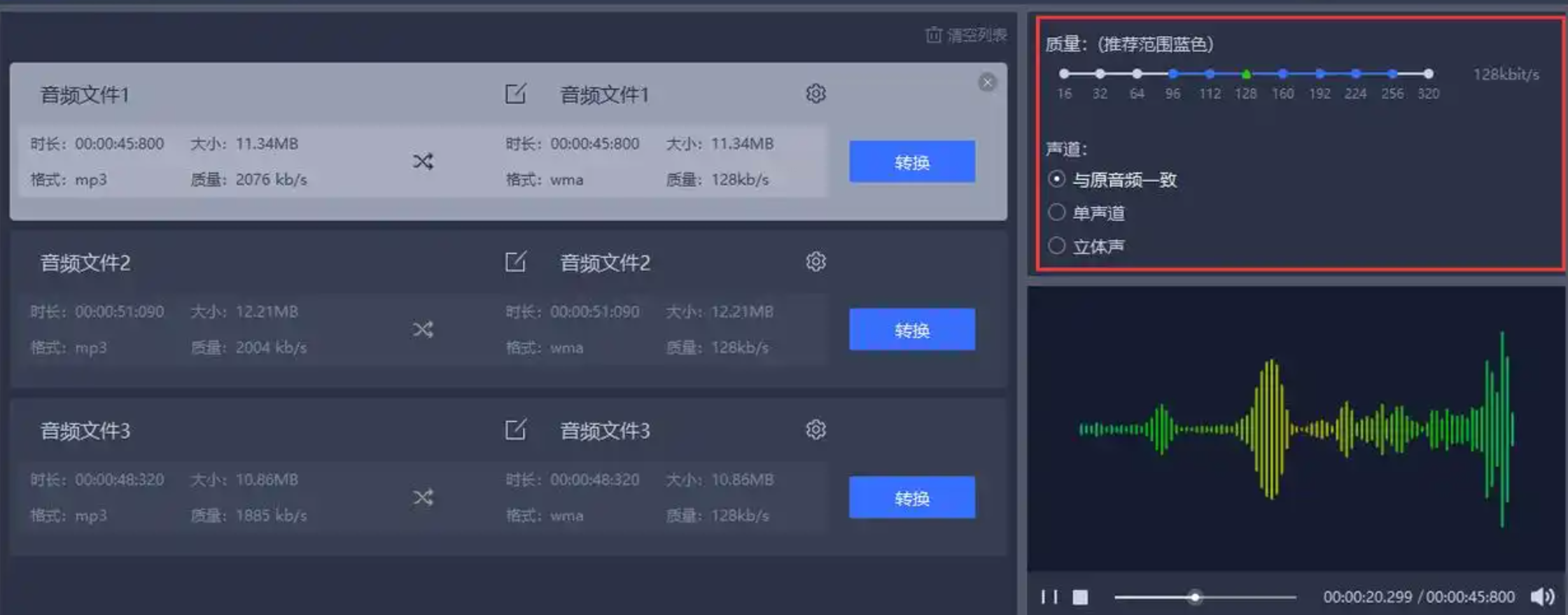 3. 调整参数区:比特率建议选择128kbps(平衡音质与文件大小),声道保持「立体声」
