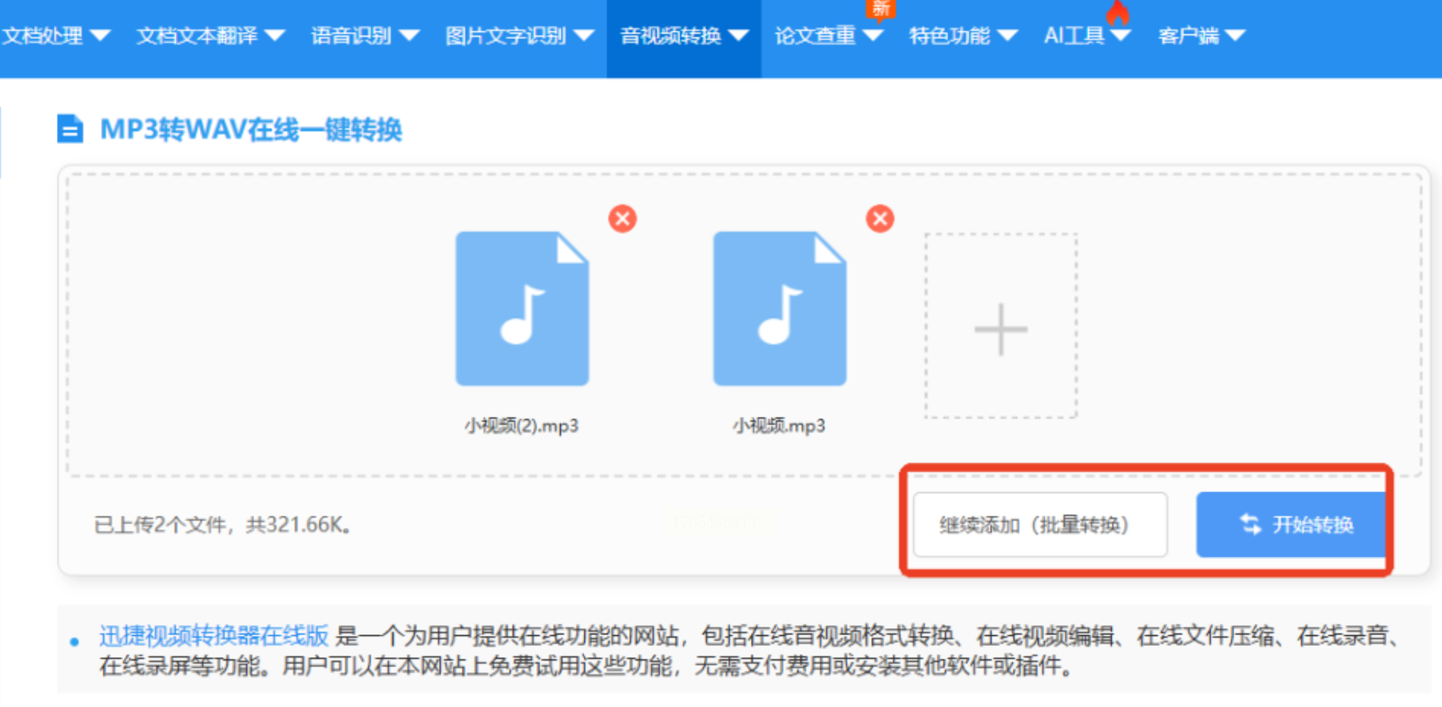 3. 在格式选项中选择「MP3」→「WMA」,可批量上传多个文件