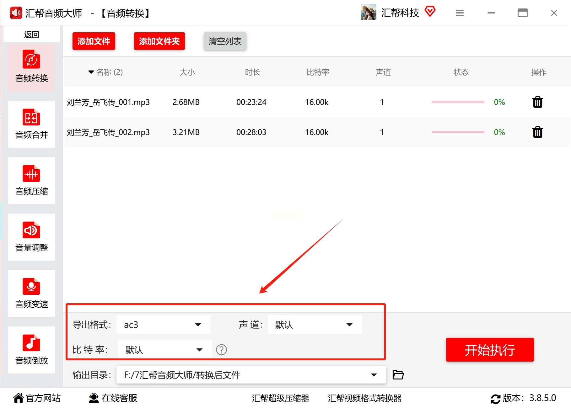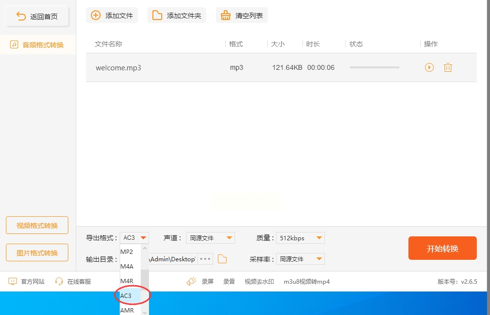 3. 设置输出格式:在软件界面的底部,找到 【输出格式】 设置区域。点击下拉菜单,在音频格式列表中选择 “AC3”。旁边的参数(如声道、比特率)一般保持默认即可,除非你有特殊的专业调整需求。