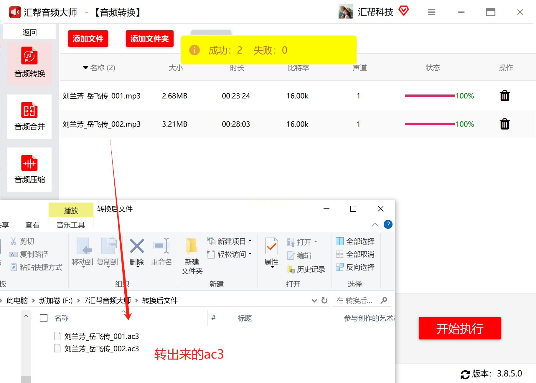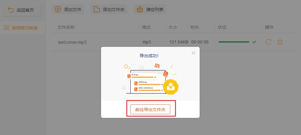 7. 完成与查看:转换全部结束后,软件会弹出“导出成功”的提示框。你可以点击提示框里的 【前往导出文件夹】,系统会自动打开资源管理器并定位到保存AC3文件的文件夹,非常贴心。
