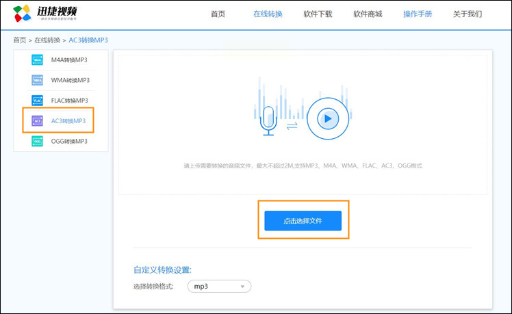 1. 打开支持音频转换的在线平台(如迅捷视频在线转换工具,注意选择正规无广告的平台),点击界面上的“选择文件”按钮。