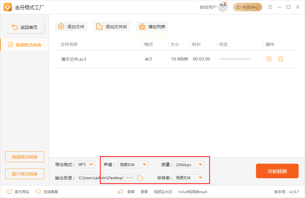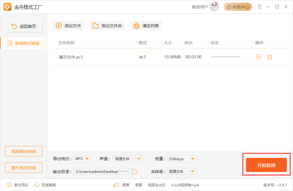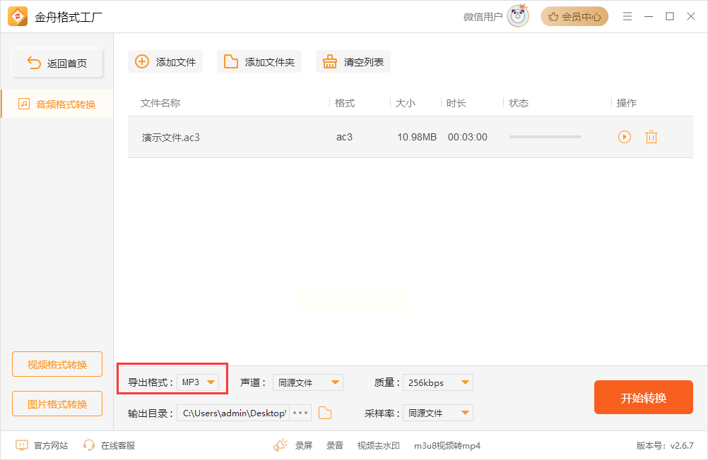 4. 点击“开始转换”,软件会自动处理文件,完成后可在输出目录中找到转换后的MP3文件,双击即可播放验证。
