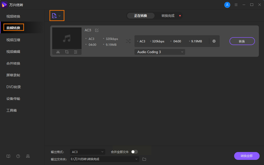 2. 打开软件后,在左侧菜单选择“音频转换”,点击“添加文件”导入AC3文件。