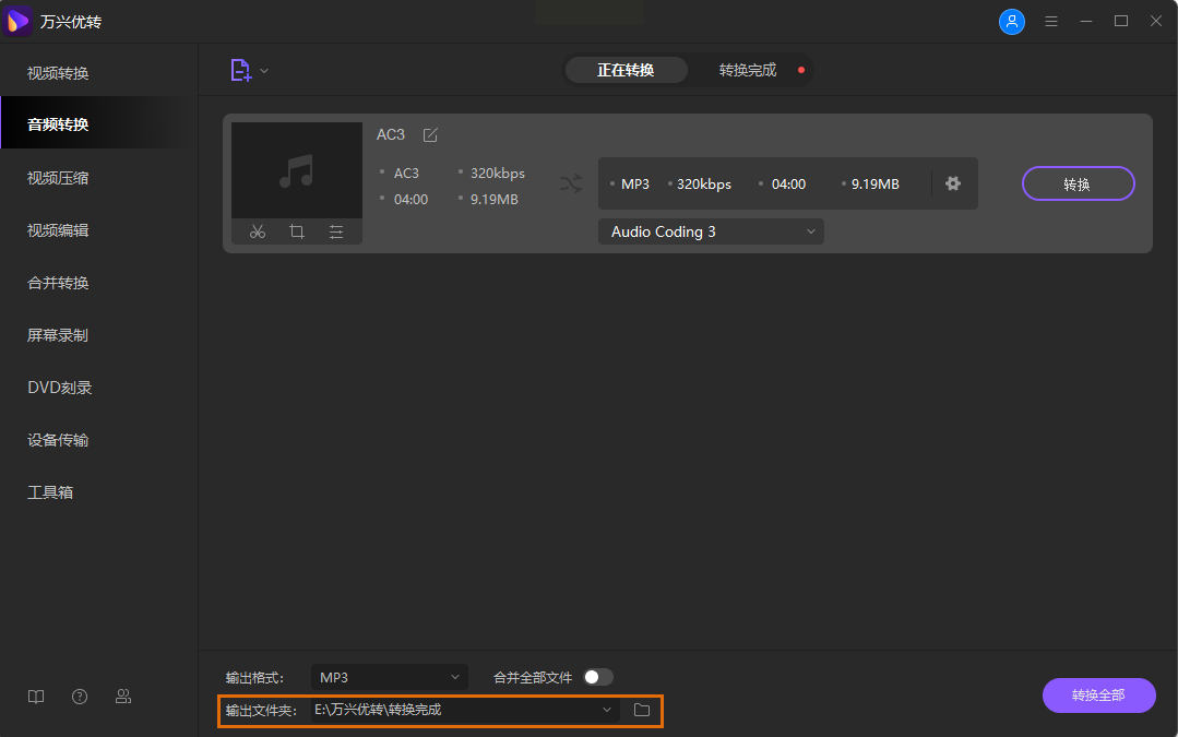 作为专业音视频转换工具,万兴优转功能丰富,操作界面友好,支持AC3与MP3等多种格式互转。