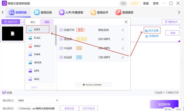 步骤三: 在输出格式选项中选择"MP3",根据需求调整参数: