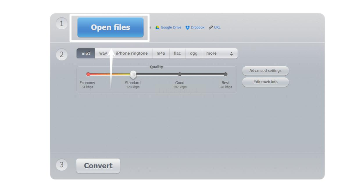 2. 上传MP3文件:点击页面上的“Open files”或类似按钮,从电脑中选中需要转换的MP3文件。