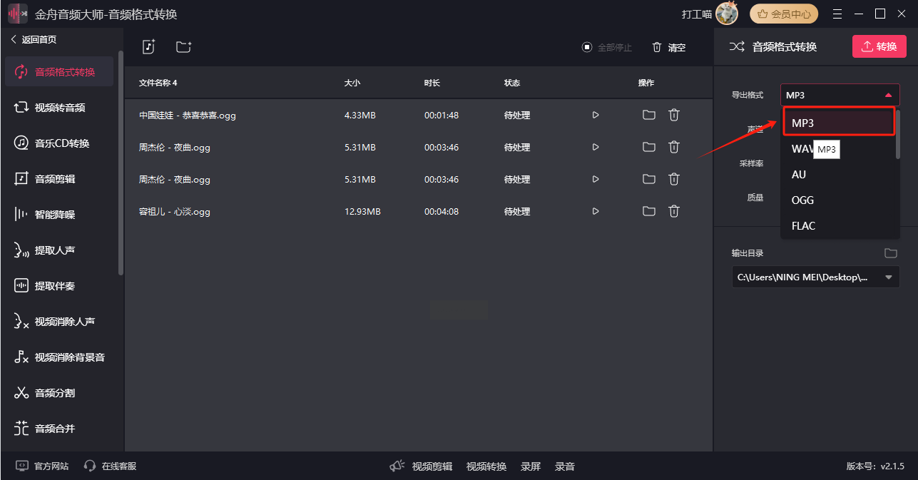 双击桌面图标打开软件后,在主界面左侧找到「音频格式转换」模块。这个功能区设计简洁,即使是电脑新手也能快速定位。