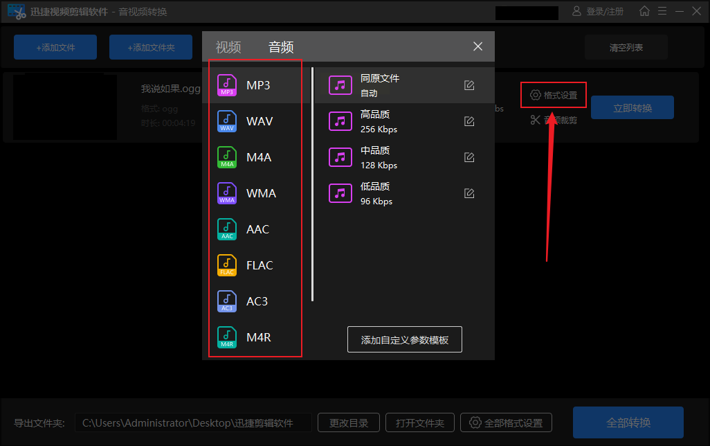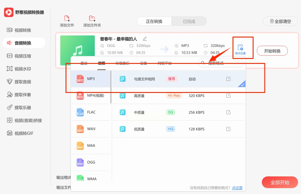 导入后点击「格式设置」,在「音频格式」下拉菜单选择MP3,可选择预设品质(标准/高清/无损)。如需更精细设置,可手动调整比特率(320kbps为无损压缩)。