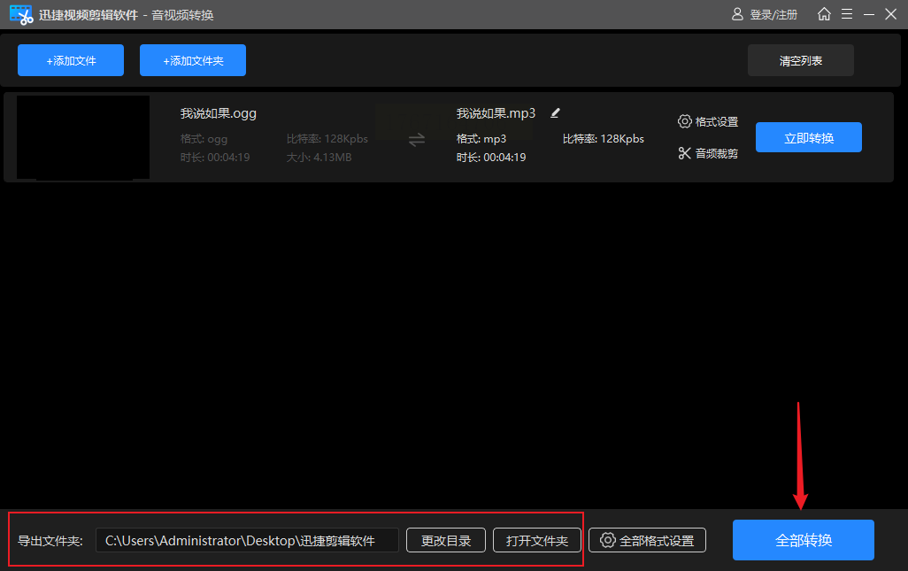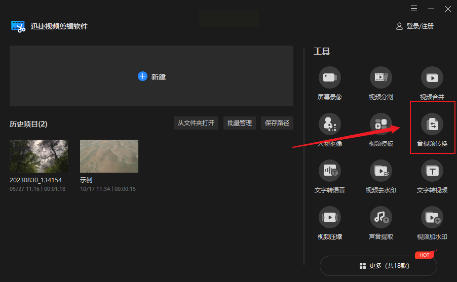 打开软件后在首页找到「音视频转换」功能,支持导入OGG、MP3、WAV等多种格式。批量导入时可直接将文件夹拖入软件。